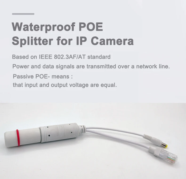 – Водоустойчив POE сплитер 48V към 12V RJ45 – висококачествен адаптер за разделяне на захранване и данни при IP камери и мрежови устройства, които не поддържат POE.