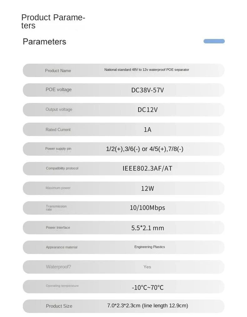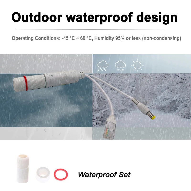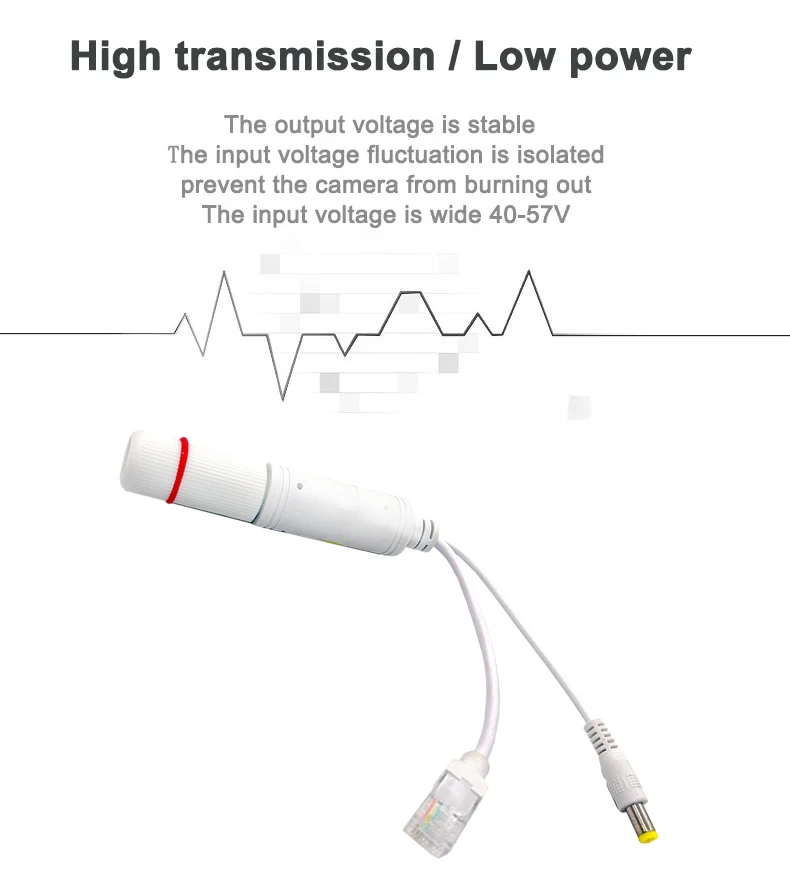 – Поддържа IEEE 802.3af/at стандарт, има широк входен диапазон (40–57V) и осигурява стабилно 12V изходно напрежение, предпазващо камерата от повреди.